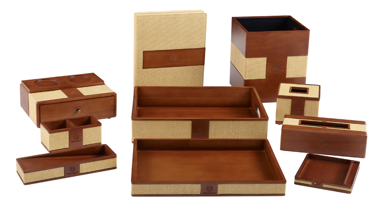 Rooted in natural beauty, this collection showcases warm wood grains and earthy hues that create a serene, grounded atmosphere. From drawer boxes to pen holders and decorative trays, each item reflects nature-inspired luxury with a modern edge.