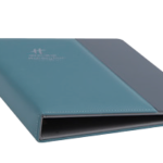 Slim tray for amenities or beverage stations, combining natural wood tones with leather and fabric accents for a stylish hotel setup.