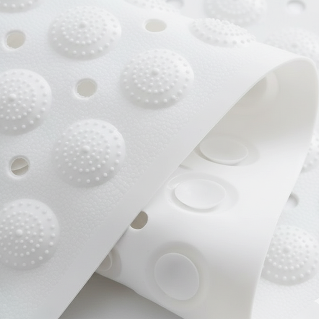 White anti-slip bath rubber mat, crafted from high-quality, water-resistant material with strong suction cups for a secure grip and enhanced bathroom safety.