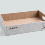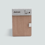 Document folder with soft linen exterior and wood leather accent, ideal for hotel directories, service guides, or guest information.