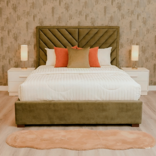 - Bed – Queen / King (customizable), triangle-stitched upholstered headboard