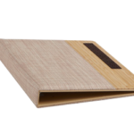 Description: A sleek and durable waste bin crafted from bamboo with a brocade-accented side handle, blending seamlessly into eco-friendly hotel spaces and office settings.