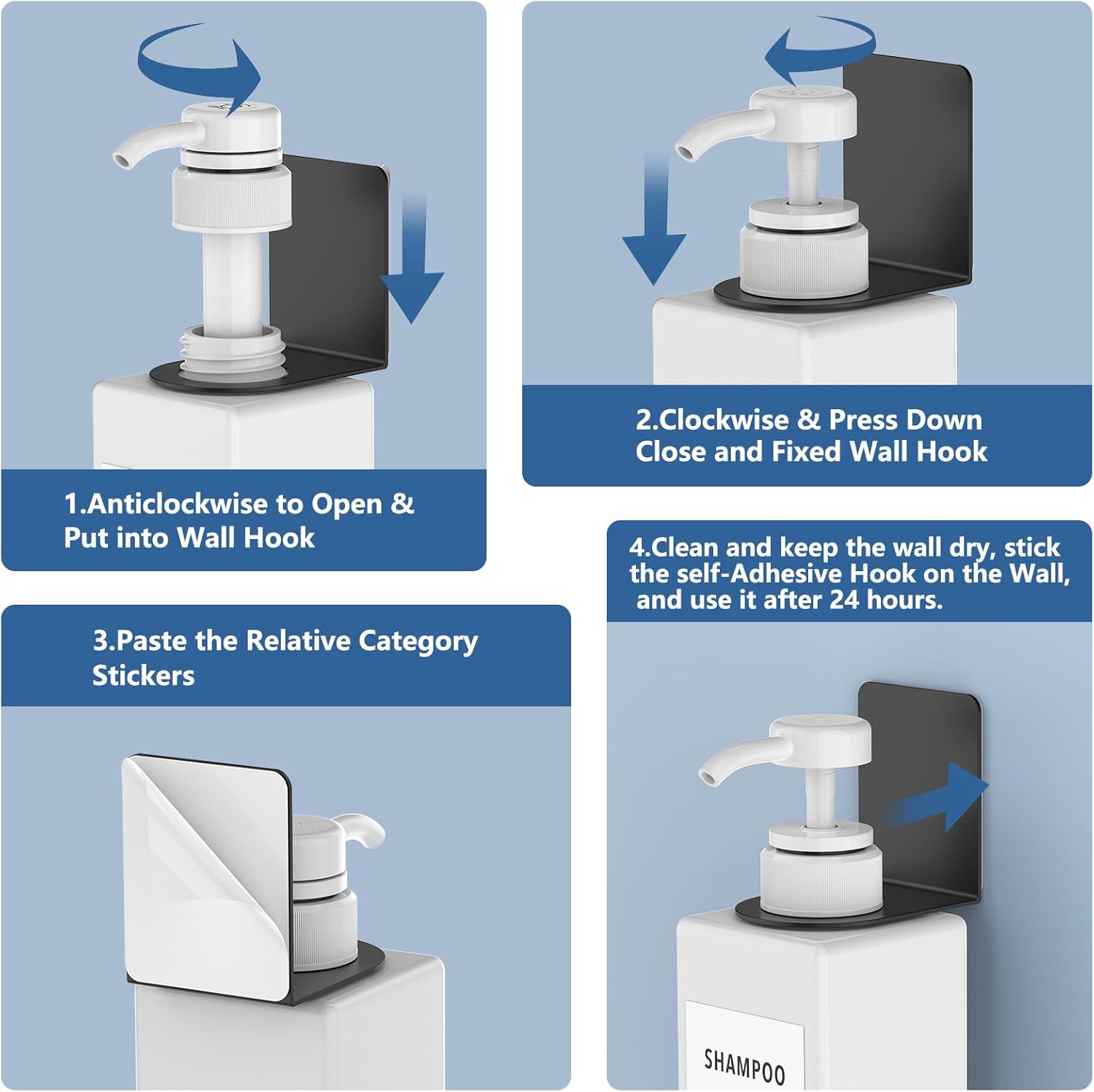Wall-Mounted 7 Moods Shampoo & Soap Dispenser Set – 3 Amber Refillable Bottles with Pump, Drill-Free Holders & Waterproof Labels.